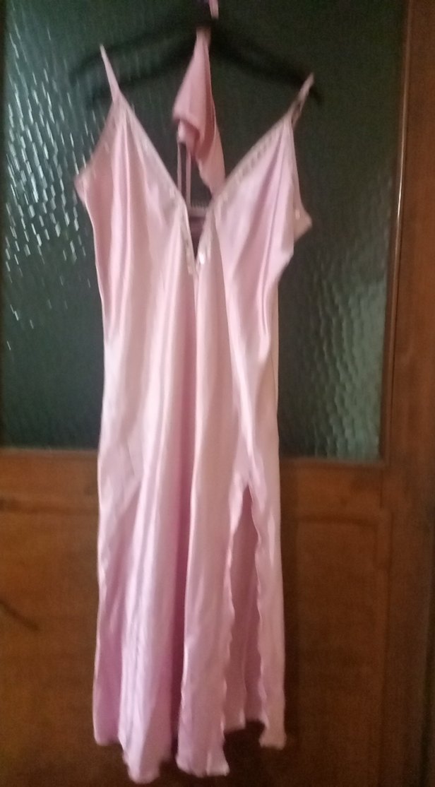 Pembe pastel renkte, uzun ve kolsuz, v yaka kesimli, bohem Paris tarzı uyumlu kadın gecelik. Düz ve saten kumaşa sahiptir.