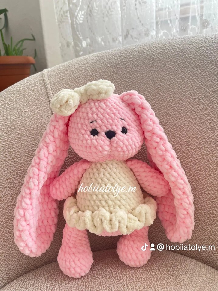 Pembe renkli uzun kulaklı peluş tavşan, krem rengi elbise ve fiyonk ile yumuşak ve sevimli bir oyuncak. istenilen renklerde hazırlanır