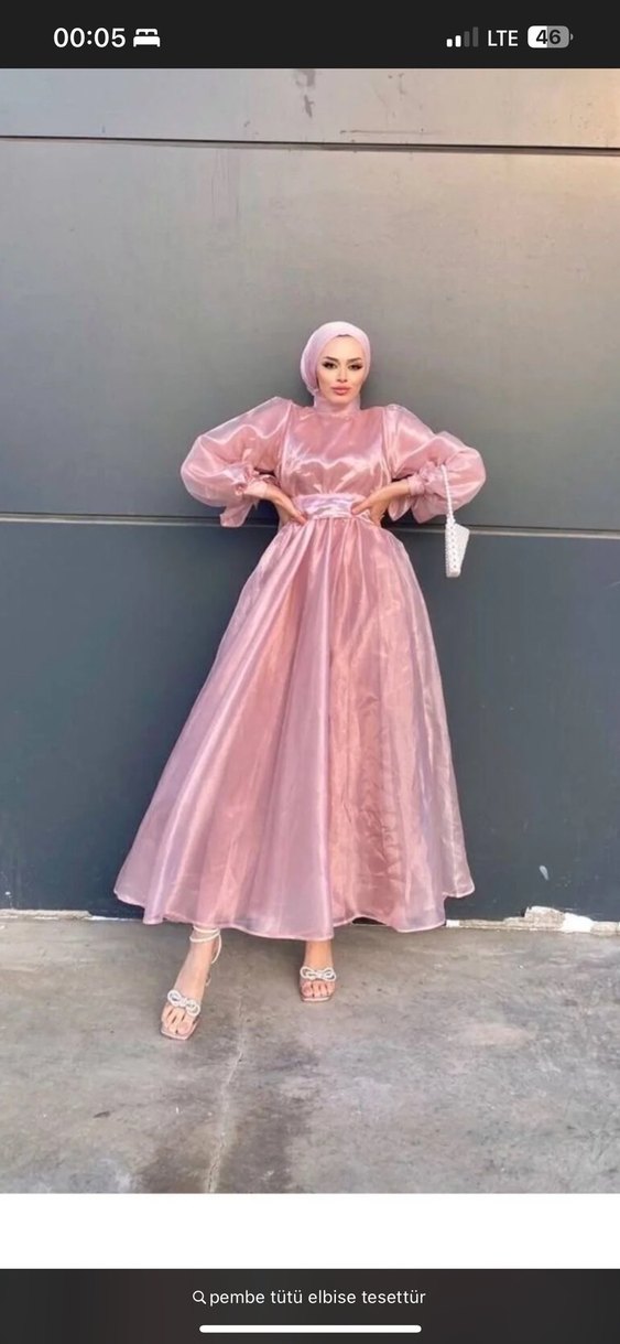 Pembe pastel renkte, uzun ve bol kesim abiye elbise. Yüksek yakalı, organze tül düğün için uygun.