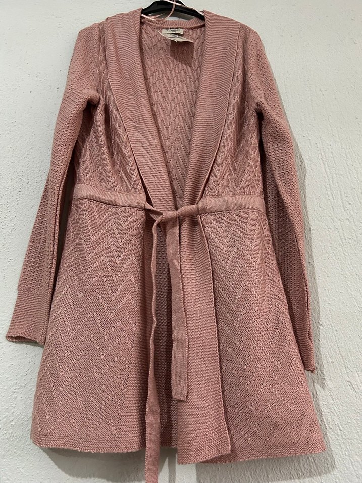 Pembe uzun örgü hırka, yakada kesik detay ve kemer ile bol bohem kesime sahiptir. Günlük kullanıma uygundur, uzun kolludur.