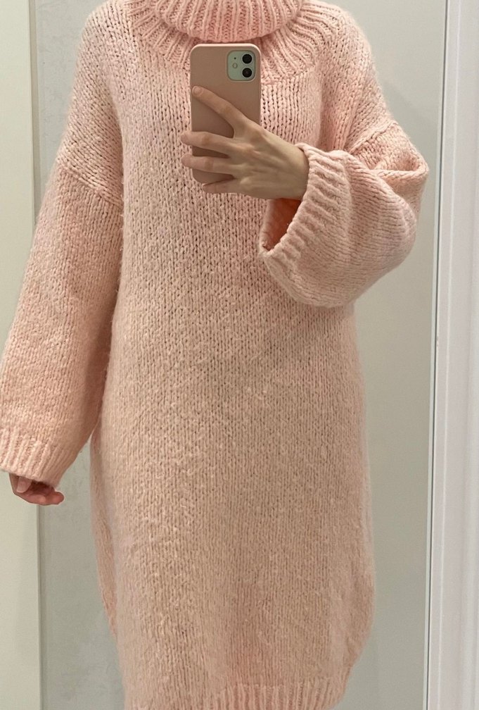 Yumuşak iplikten örülmüş, uzun ve bol kesimli, yüksek yakalı pembe kadın kazak. Rahat ve sade tarzıyla günlük kullanım için uygundur. Bir kez kullanıldı temizdir