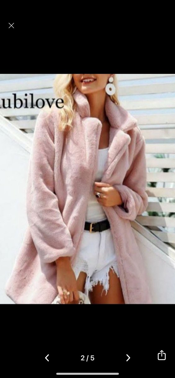 Pembe uzun peluş kaban, bol kesim ve uzun kolludur. Notlu yaka ve baskılı detaylara sahiptir, rahat sokak stiline uygundur.