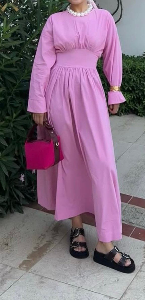 Pembe uzun elbise, bol kesim ve pilili detaylara sahip, askısız yakası ve yumuşak sentetik kumağı ile günlük kullanım için uygundur.