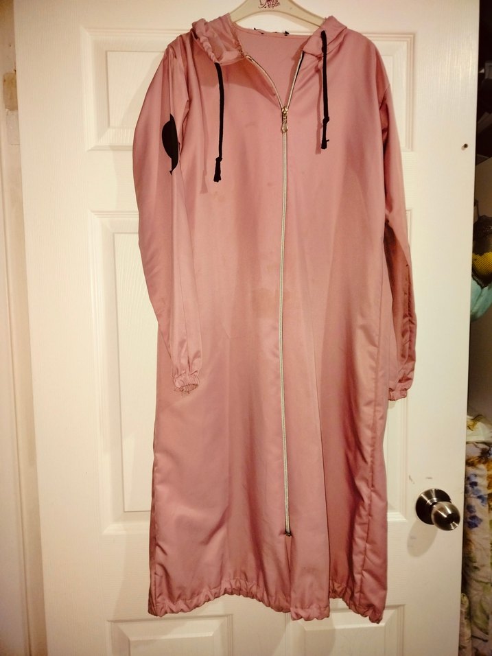 Kadınlar için uzun, rahat kesim yağmurluk. Uzun kollu, yüksek yakalı ve fermuarlı. Pastel pembe, satenimsi dokuda, günlük kullanıma uygun. ️