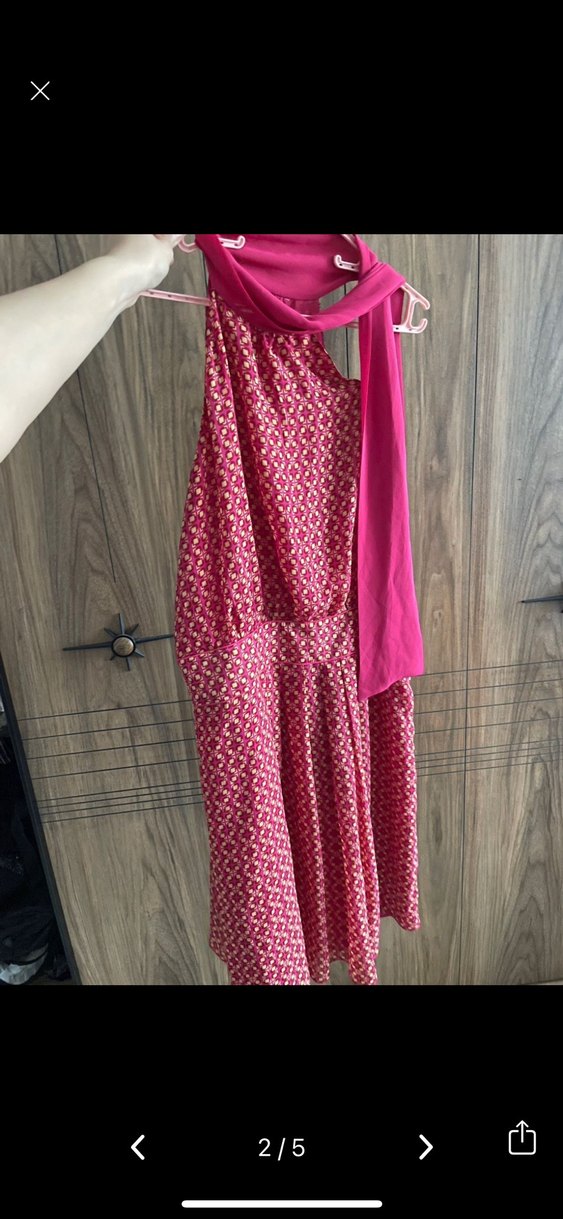 Pembe, uzun, askılı, salaş kesim elbise, yüksek yakalı ve renkli batik desenlidir. Yumuşak sentetik kumaştan, drapeli detaylıdır. 38 beden birine de olur. İade kabul etmiyorum.