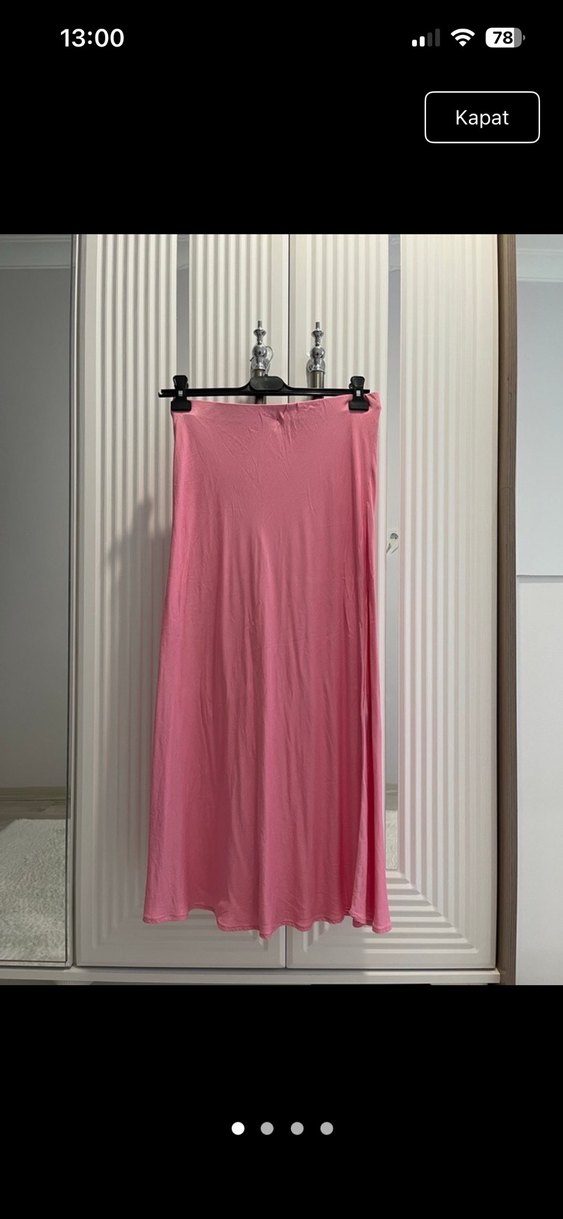 Pembe renkte, uzun ve salaş kesimli, drapeli detaylı, ipeksi dokulu etek. Minimalist ve desensiz tasarımıyla günlük kullanıma uygun.