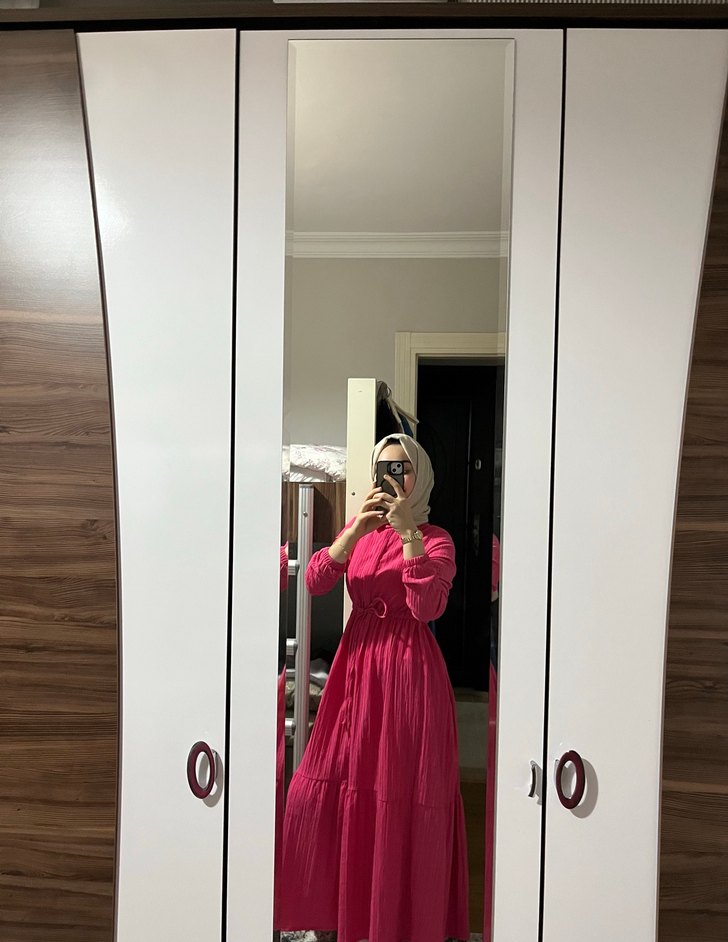 Parlak pembe renkte, salaş kesimli, drapeli ve askılı kollu uzun elbise. Yüksek yakalı, ipeksi dokulu ve batik desenlidir, günlük kullanıma uygundur.