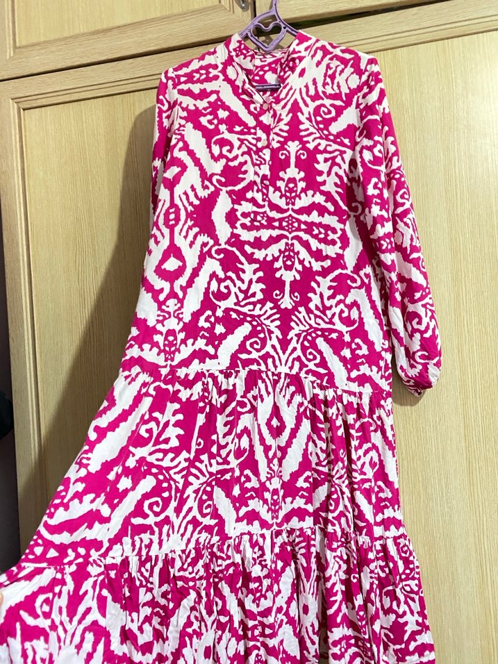 Renkli pembe batik desenli, uzun kollu, V yakalı, salaş kesim bohem tarzı uzun elbise. Sentetik kumaş ve fırfır detaylarıyla dikkat çeker. Severek kullandım kısa geldiği için satıyorum