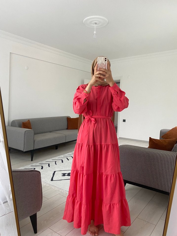 Pembe Uzun Salaş Fırfırlı Bohem Elbise