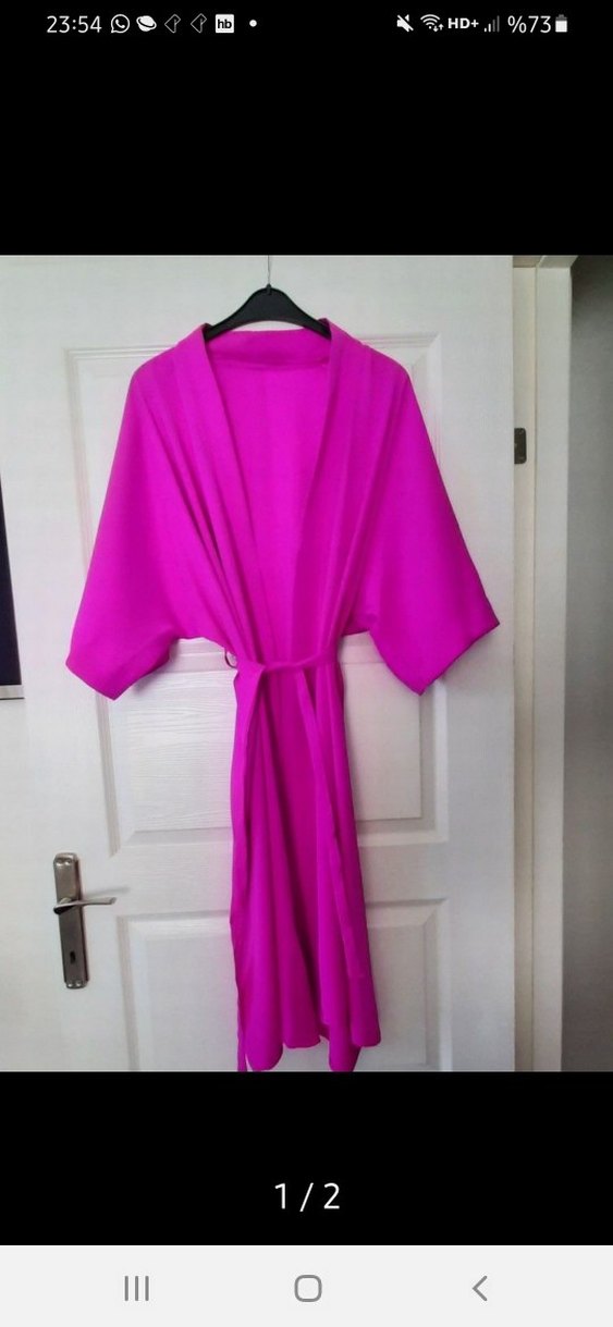 Pembe renkli, uzun ve salaş kesim kimono Minimalist, modern tarzda, kollu ve desensizdir. Rahat kullanım sağlar.