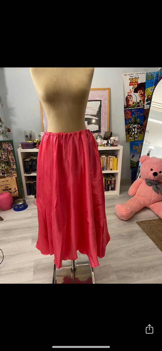 Pembe parlak, ipek dokulu, drapeli uzun ve salaş kesim kadın eteği, bohem vintage tarzı için uygundur ✨