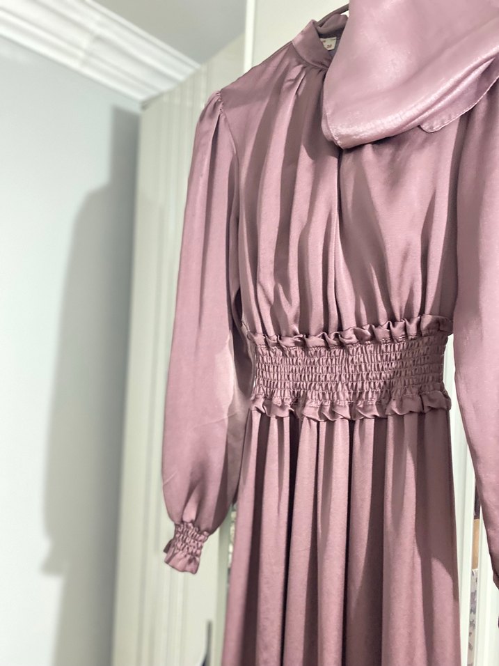 Pembe renkte, yüksek yakalı ve drapeli tasarıma sahip uzun, saten dokulu elbisedir. İnce askılı kolları ve parlak yüzeyiyle klasik şıklık sunar. Şal dahil