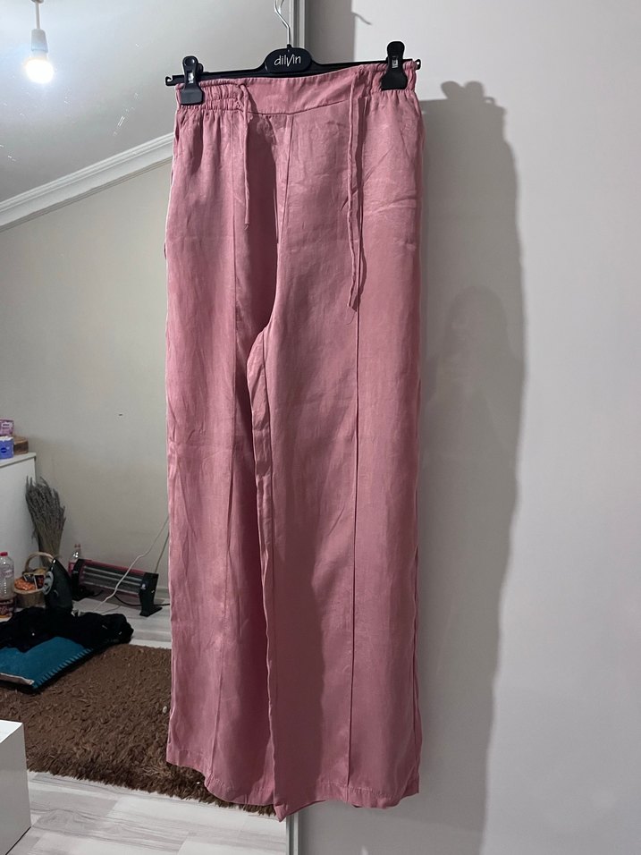 Pembe renkte, uzun ve salaş kesim olan bu kadın kumaş pantolon, ipeksi dokusuyla minimalist ve rahat bir şıklık sunar.