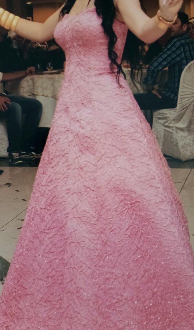 Bu pembe uzun abiye elbise, drapeli tasarımı ve tek omuzlu kesimiyle dikkat çeker. Parlak ve desensiz, bohem tarzda şık bir seçimdir.
