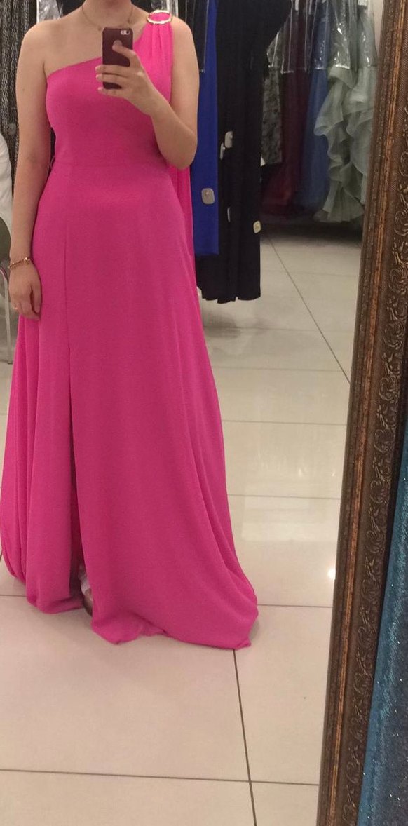 Uzun, satenimsi kumaştan yapılmış pembe abiyesi, straplez yaka ve drapeli bol kesimiyle modern bir düğün görünümü sunar. Hiç giyilmedi