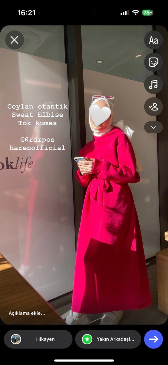Pembe uzun elbise, yüksek yakalı ve uzun kolludur. Kalın, yumuşak kumaştan yapılmış, rahat ve bol kesimdir. Günlük kullanıma uygundur.