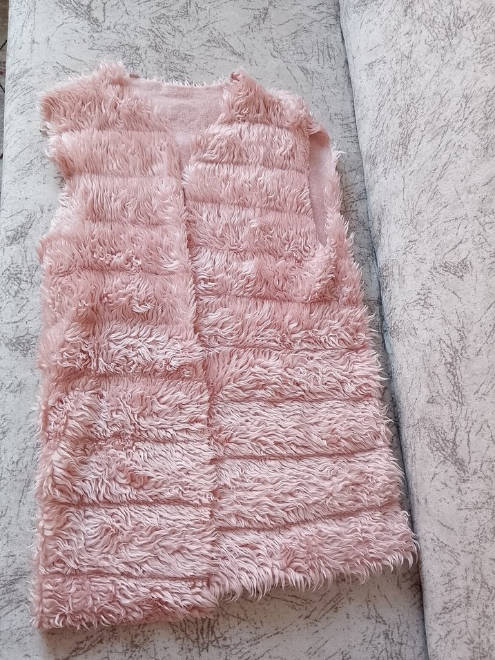 Pembe, uzun kesim, tüylü detaylı, kolsuz kadın yelek. V yaka ve bohem tarzda, yumuşak sentetik kumaştan üretilmiştir. bir kaç kere giydim