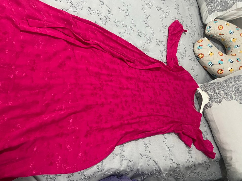 Pembe uzun, v yaka, kolsuz, drapeli ve vücuda oturan bohem tarzda kadın elbisesi, düğünler için uygundur.