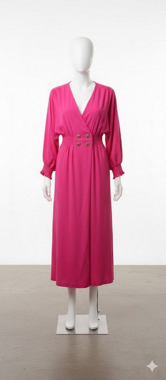 Pembe uzun elbise, V yaka ve kemerli beli ile bol kesim sunar. Uzun kollu, düz desenli ve yumuşak sentetik kumaştan yapılmıştır.