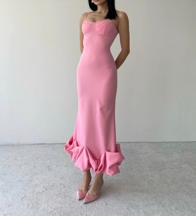 pembe uzun elbise, askılı ve straplez yakaya sahip. Sentetik kumaştan üretilmiş, volan detaylı ve düğünler için uygun rahat kesim.