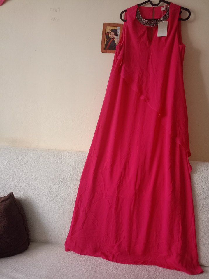 pembe renkte, kolsuz, salaş kesim, drapeli uzun elbise. Minimalist bohem tarzıyla parti için uygun.