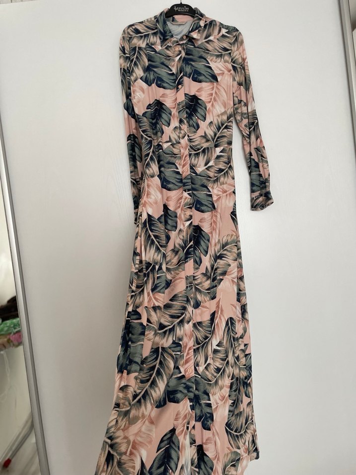 Pembe renkli, yüksek yakalı ve uzun kollu, uzun elbise. Drapeli siluet ve pastel tonlarda yaprak desenli bohem tarzını yansıtıyor.