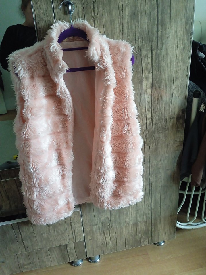 Pembe renkte, uzun boyda, yumuşak dokulu ve kürklü detaylı, kolsuz, bol kesim kadın yeleği. Bohem tarzda, günlük kullanıma uygun.iç astarında küçük bir kısmı dikilmiştir