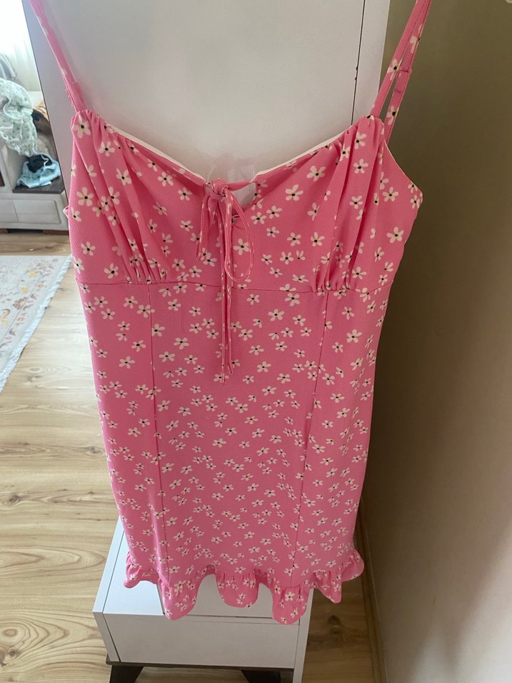 Pembe, küçük çiçek desenli, askılı, V yaka ve volan detaylı midi elbise.