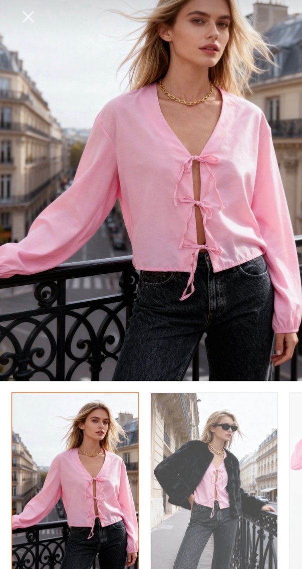 Pembe V Yaka Bağcıklı Kadın Gömlek