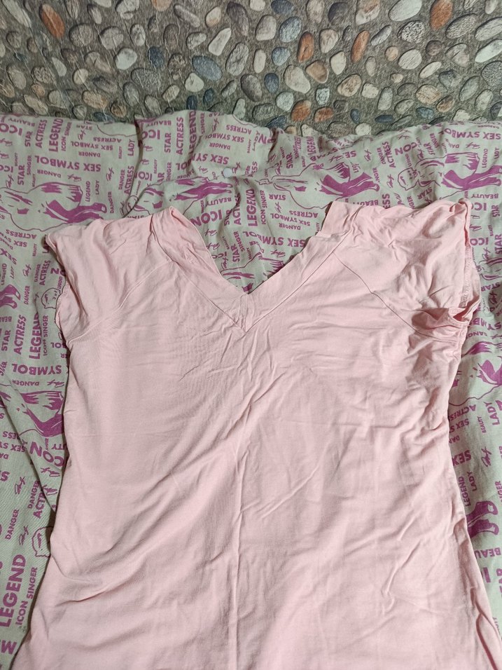 Pembe pastel tonlarında, V yaka ve bluz. Normal midi boyda, vücuda oturan ve drapeli tasarıma sahip, yumuşak sentetik kumaştan üretilmiştir. Günlük kullanıma uygun.