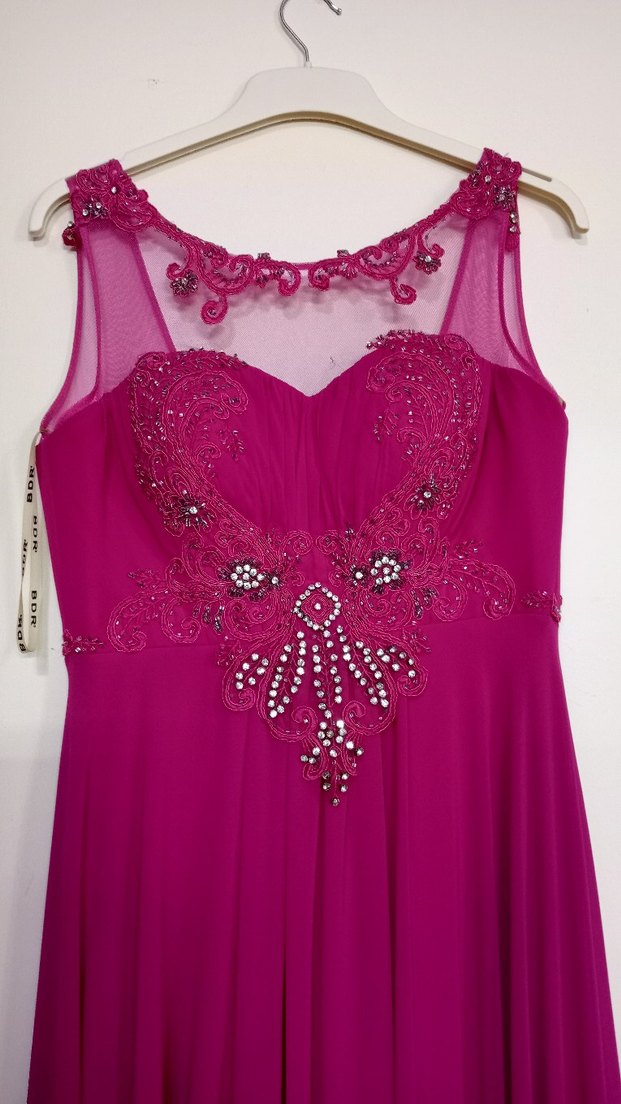 Pembe renkli, V yakalı ve kolsuz uzun abiye elbise. Renkli işlemeler ve boncuk detaylarıyla süslenmiş, modern klasik tarzda şık bir seçim. 40 beden,Alana şimdiden hayırlı olsun