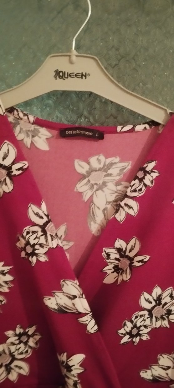 V yaka ve kolsuz tasarıma sahip, drapeli bol kesim pembe desenli . Kısa boy, bohem ve retro tarzda, sentetik kumaştan üretilmiştir.