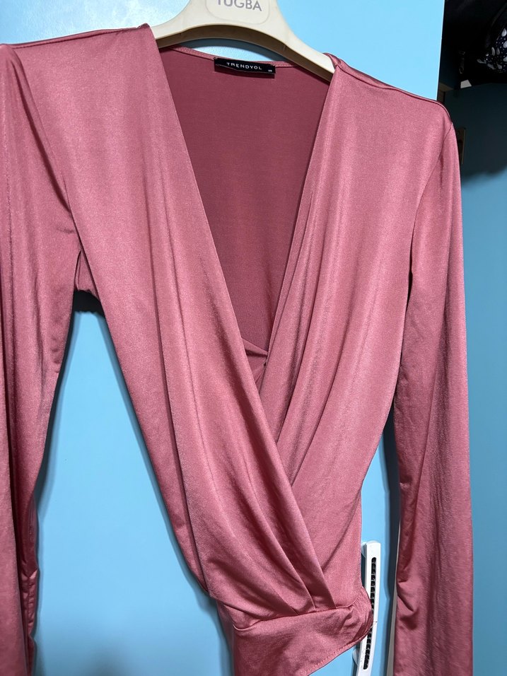 Kadınlar için pembe, drapeli ve V yaka tasarıma sahip, ince ve ipeksi kumaştan yapılmış, uzun kollu, normal boyda