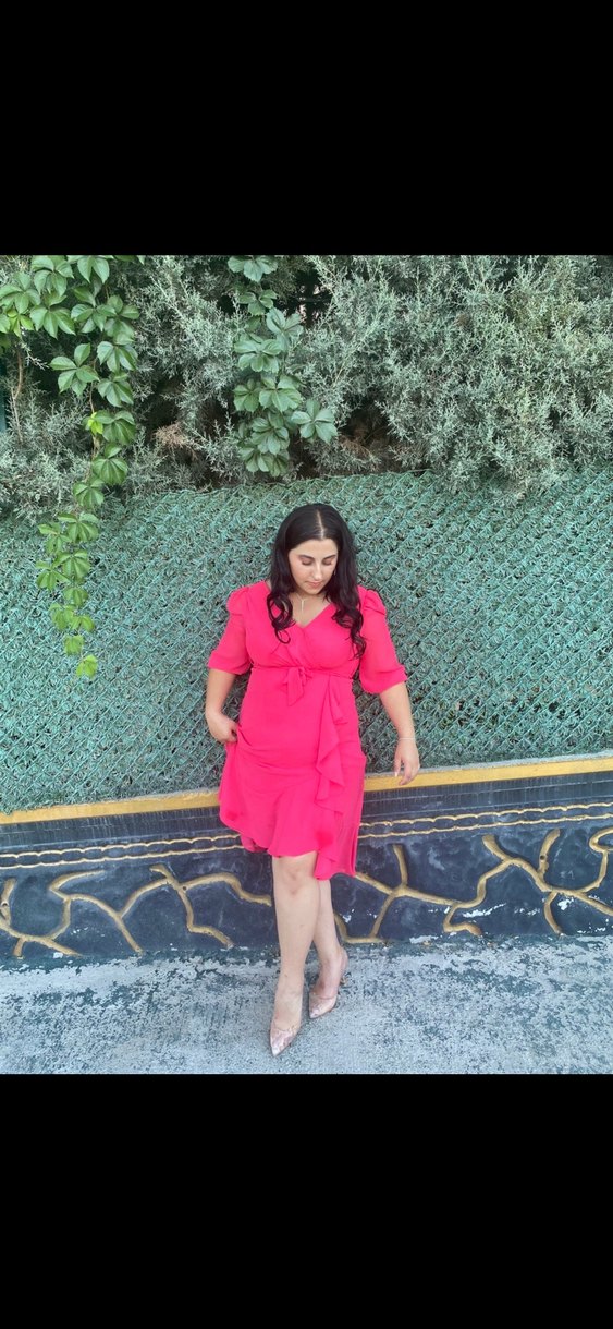 Parlak sentetik kumaştan, V yakalı ve drapeli detaylı, bol kesim pembe mini elbise. Romantik buluşmalar için uygun. Arkası ipli 44 beden