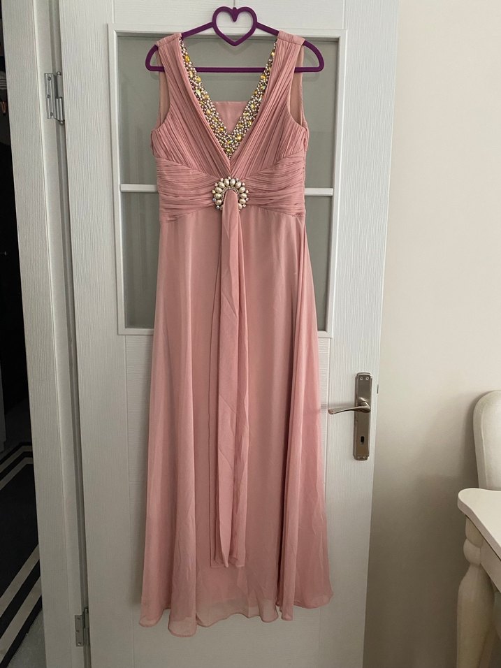 Fitted kesim, V yakalı ve kolsuz uzun abiye elbise. Drapeli detaylar ve belde süslemeye sahip, pastel pembe renkte, düğünler için uygun. 38-40 bedenlere uyumludur