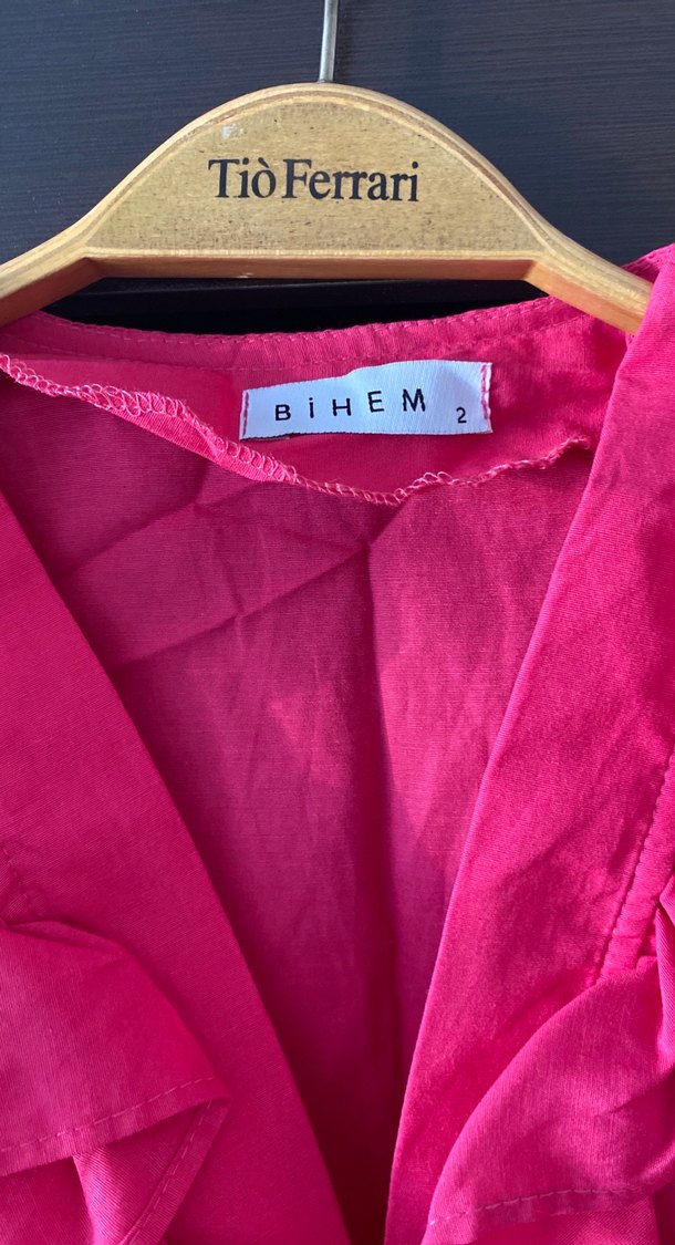Pembe, parlak ipeksi kumaştan, V yakalı, düğmeli, uzun kollu, bol ve kısa kesim hamile bluzu. Bohem desenli, romantik akşamlar için uygun. Tesettür ürün hamileye de olur