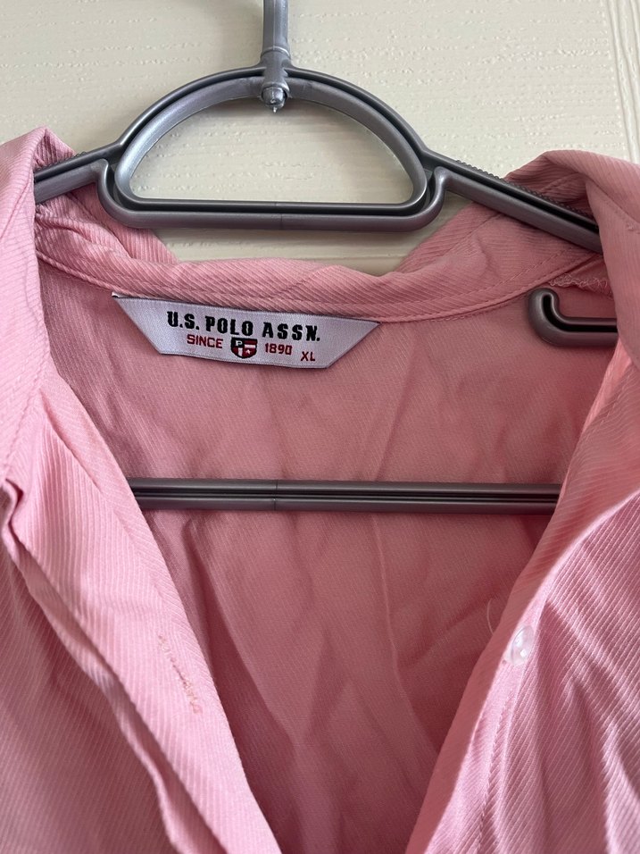 Sentetik kumaştan yapılmış, düğmeli, V yakalı ve uzun kollu pembe, bol kesim gömlek. Üzerinde baskı deseni ve U.S. Polo Assn. markası bulunur.