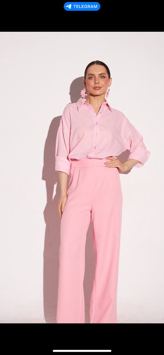Pastel pembe renkte, V yakalı ve düğmeli, uzun kollu, pamuklu kumaştan, rahat kesim ofis gömleği.