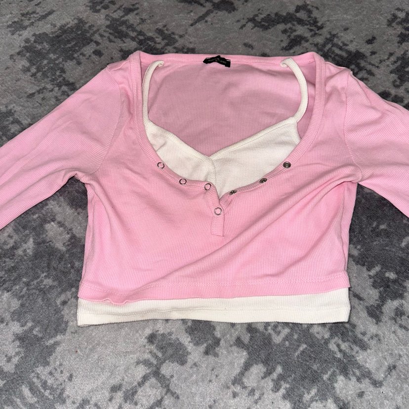 Pamuklu, düğmeli V yaka ve uzun kollu, pembe pastel renkli, vücuda oturan kız tişörtü, sokak stili için uygun.