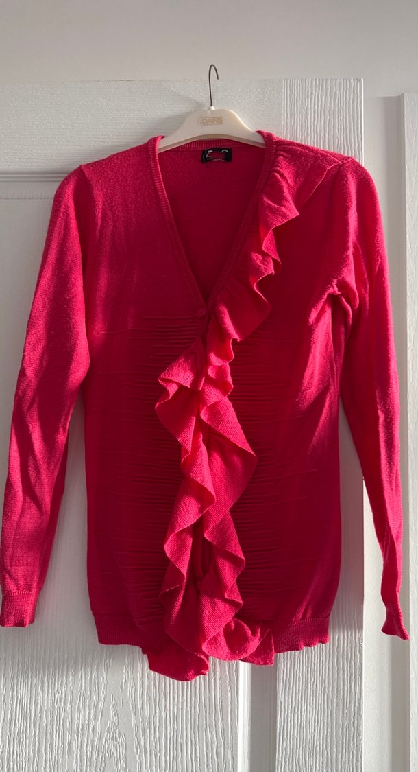 Pembe, keten kumaştan, V yaka ve uzun kollu, fitted kesim hamile hırka. Ön kısmında fırfır detaylı, çağdaş Paris tarzında.