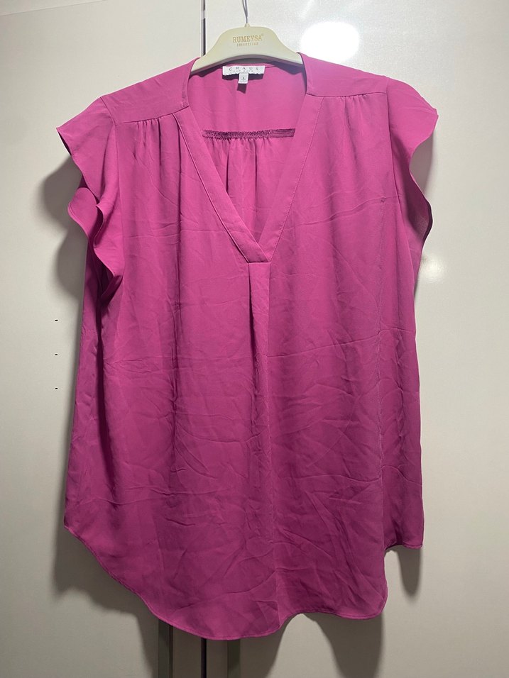 Pembe renkli, V yakalı ve kısa fırfırlı kollu, rahat kesim kadın bluz. Yumuşak sentetik kumaştan, midi boyda, minimalist ve bohem tarzda günlük kullanım için uygun. New york tan alındı