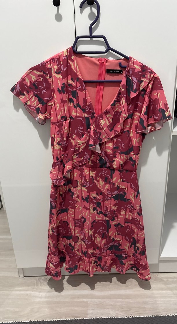 V yaka ve kısa kollu, pembe tonlarında bağlama desenli, yumuşak sentetik kumaştan yapılmış, fırfır detaylı ve vücuda oturan midi elbise.