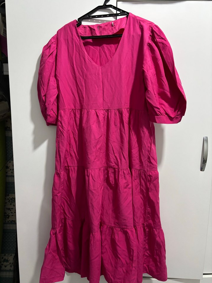 Pembe keten midi elbise, bol kesim, kısa kollu ve V yakalıdır. Fırfır detayları ve parlak dokusu günlük kullanım için uygundur. M-L uyumludur