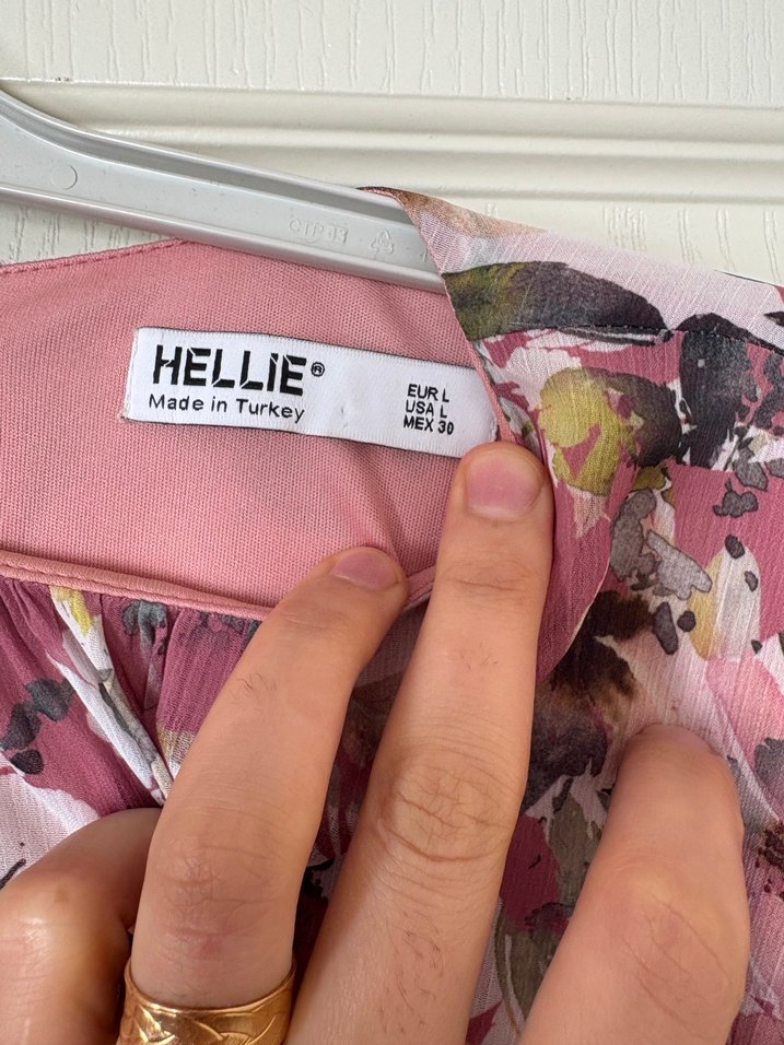 Pembe, V yakalı, ince askılı, baskılı pastel desenli, fırfırlı, normal boy, dar kesim hamile bluzu. HELLiE markası, Türkiye yapımı.