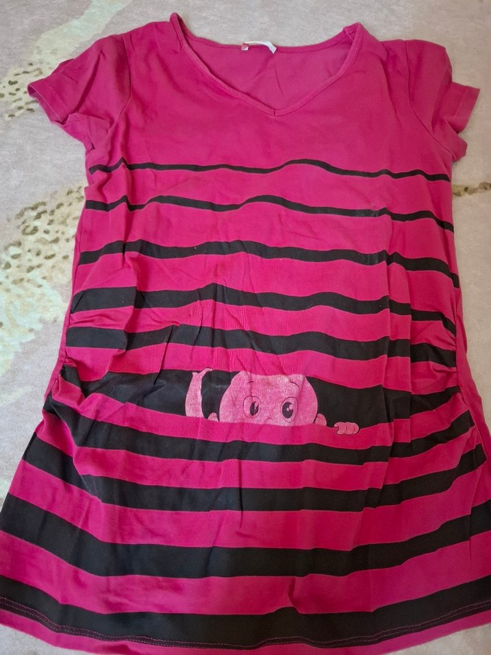V yaka ve kısa kollu, pembe renkli hamile tişörtü. Renkli çizgiler ve baskılı desenle günlük rahat sokak stili sunar.