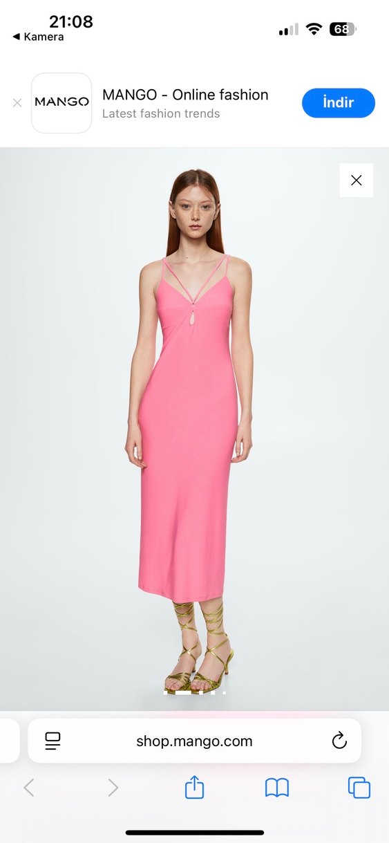 İnce askılı, V yaka, pastel pembe renkte, satenimsi kumaştan yapılmış, vücuda oturan uzun elbisedir. Romantik akşamlar için şık ve rahat bir tercihtir.