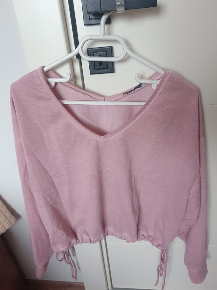 Pembe V Yaka Kadın Bol Kesim Crop Bluz