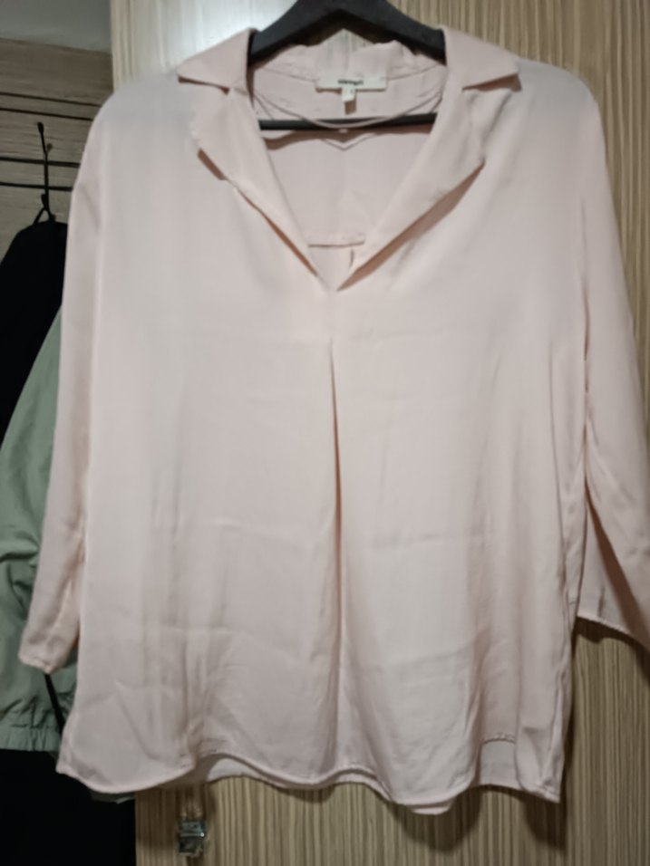 Pembe renkli, V yakalı, kısa kollu ve midi boyda kadın gömlek. İpek gibi dokusuyla rahat ve salaş, minimal tarzda günlük kullanıma uygun.