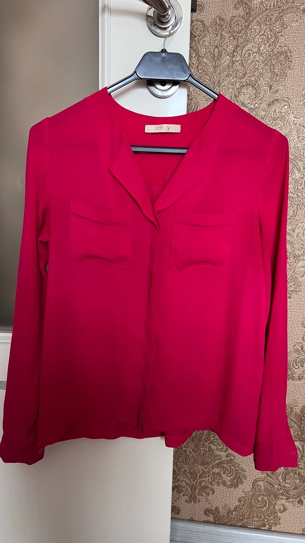 Parlak pembe renkte, V yakalı ve uzun kollu kadın gömleği. satenimsi kumaştan yapılmıştır. Ofis kullanımı için uygundur.