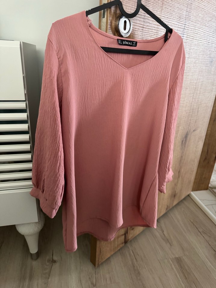 Pastel pembe renkli, V yakalı ve uzun kollu keten kumaştan yapılmış kadın bluzudur. Rahat kesimi ve normal midi boyu ile gündelik kullanıma uygundur, zahmetsiz şıklık sunar.